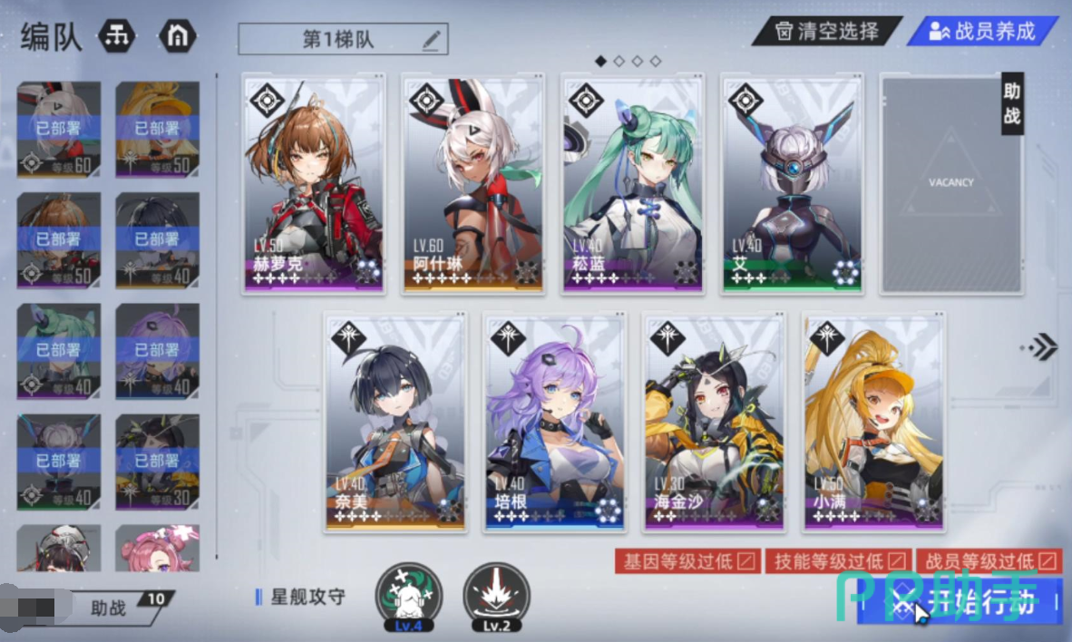 作为塔防系列的游戏玩家在每一次进入关卡之前都需要选择自己携带的角色。玩家需要根据地图的特性以及敌人的类型合理地选择自己的角色,不可以全部选择高台输出位,也不能全部选择地面输出位,需要两者兼顾,同时玩家还需要考虑到队伍的回复问题,正常情况下都会携带合理数量的盾卫、近战位、高台位加入游戏。