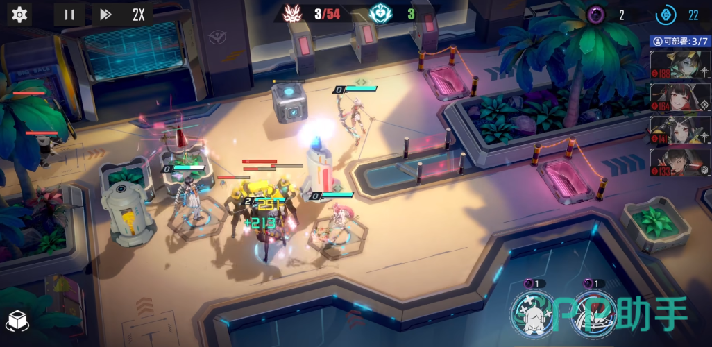 在作战的过程当中,部署资源将会不断的回复,这个时候玩家需要将剩下的两个治愈角色放置上场,莫妮卡在后,安息香在前的顺序放置,放置完成之后玩家的阵容就算成型了,接下来玩家需要注意角色的技能释放时机,根据场上的情况释放技能即可,技能释放相对比较灵活,输出技能回转完成了就释放。