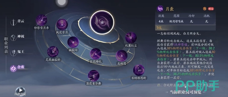 谈及具体技能运用,月袭作为合欢的基础位移技很好用,该技能无冷却时间的特性,赋予了角色极高的机动自由度,每次施展月袭,角色会向前短距离瞬移并对路径上的敌人造成伤害,连续使用四次后,第五次月袭将触发强化效果,不仅伤害提升,还会为角色附加一层刃标记,这层刀刃印记既是后续技能增伤的关键,也是维持输出循环的重要资源,实战中,玩家可通过灵活走位穿插于敌阵之中,利用月袭的位移特性规避致命技能,同时叠加刃层数准备后续的爆发效果。