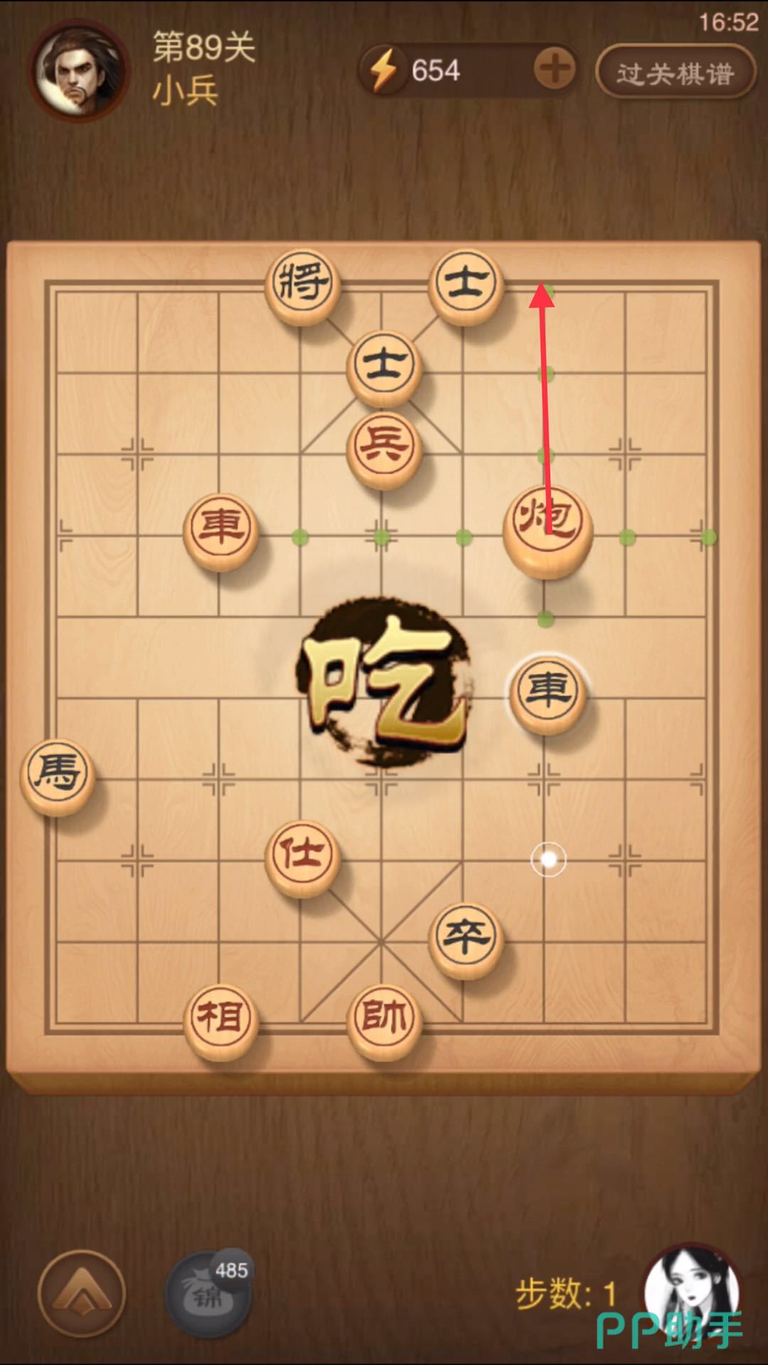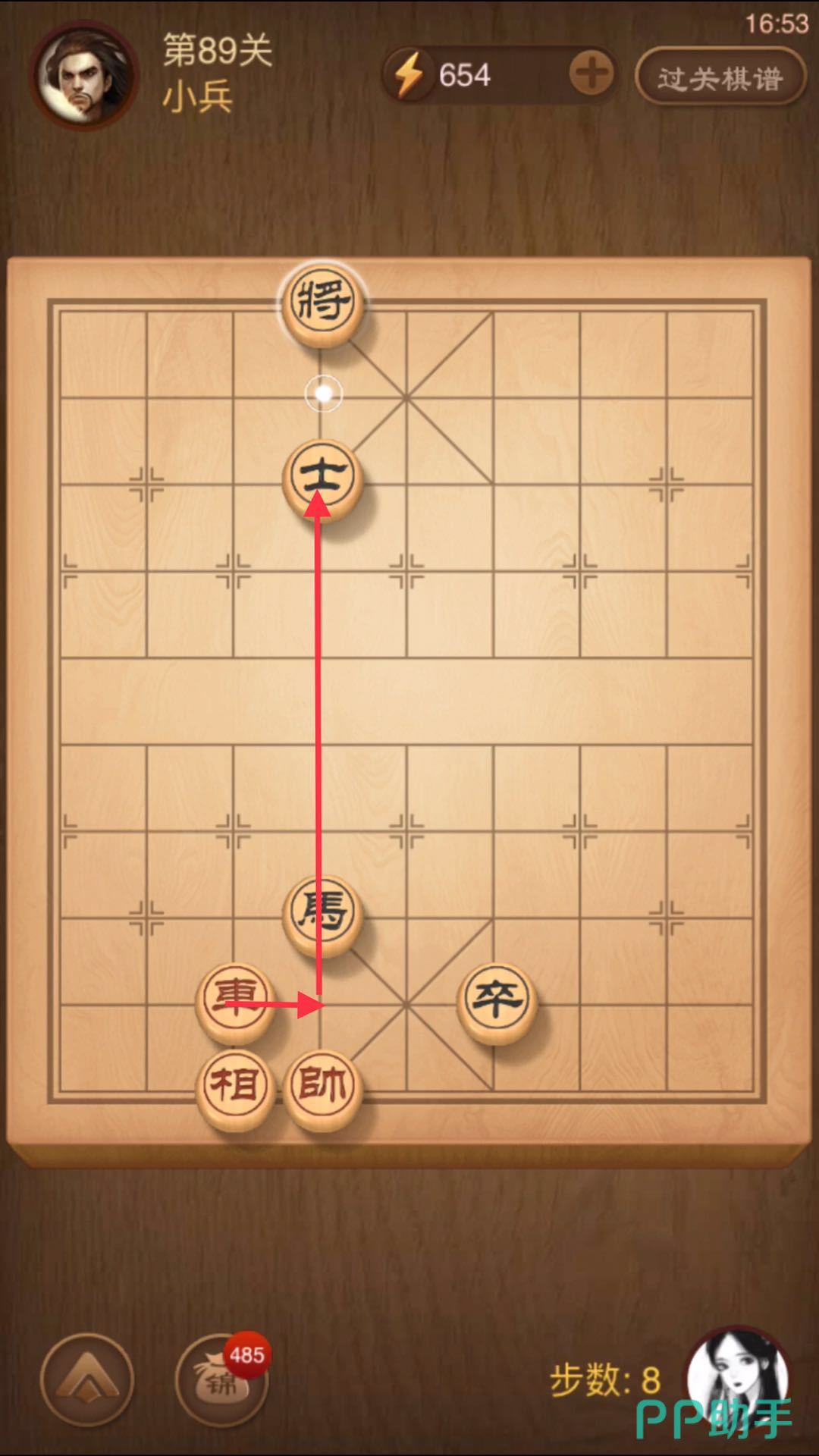 4、为了不让我们将军,敌方将会往上移动,这时候我们用兵把敌方士吃掉,顺便将军。