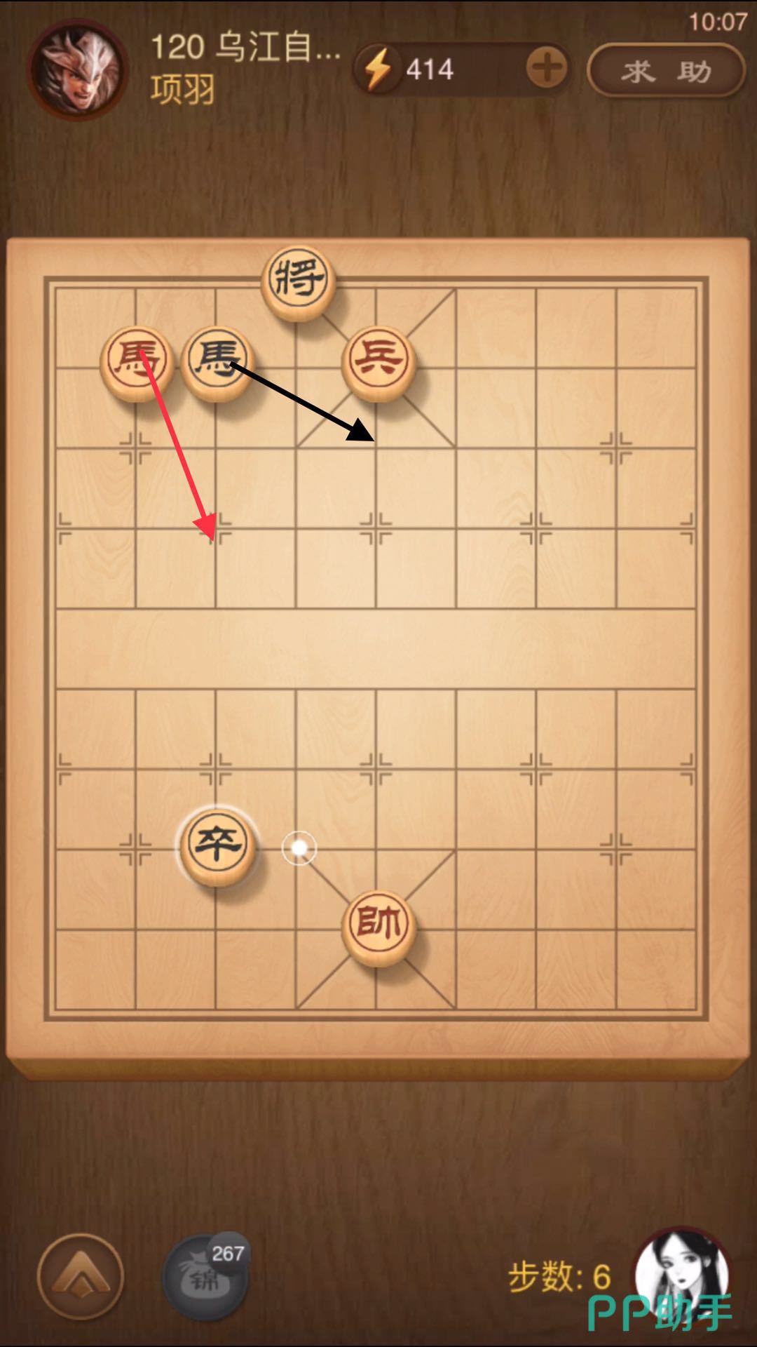 3、继续将军之后,敌方的将会再次向左移动,我们不用在动车了,这次我们跳马,把身处于右边的马跳到小编为大家标注的位置,再次将军。