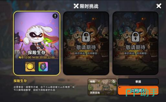 游戏中还有限时的生存玩法,每天中午和晚上限时开放,中午在十二点到两点,晚上则是八点到十点。在此挑战中匹配达到30人后即可开局,玩家可以在随机出现三位满级的英雄中任意选一位,没错在这个名为“探险生存”的模式里不存在数值的压制,人人都是满星王者,但如果三位英雄你觉得都不好操作,也可以选择使用一定数量的钻石重置(上限刷3次),这也是游戏方为了让新手们更快的掌握每个人物的特点而设定,也是用心良苦了。在单排模式里,进入任意关卡,我们都可以看到随处可见的宝箱,玩家就将开启争夺资源的大战了,在单排里更考验的是玩家的操作和对游戏的熟悉度了,所以开到宝箱还请尽快离开。