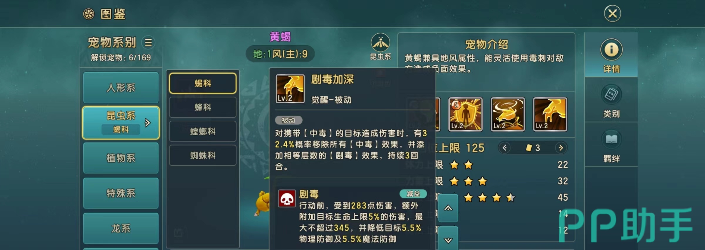 黄蝎属于蝎科宠物,而在蝎科宠物中,技能属性还是非常强的,并且在战斗过程中具有一定的优势,拥有一定的防御能力和攻击效果,而黄歇主要也是作为防御型的宠物来进行输出,拥有剧毒护盾,这也是所有蝎类宠物共有的特点,是一个非常隐秘的猎手,在攻击时可以选择对方一个单体的目标,然后添加剧毒护盾。