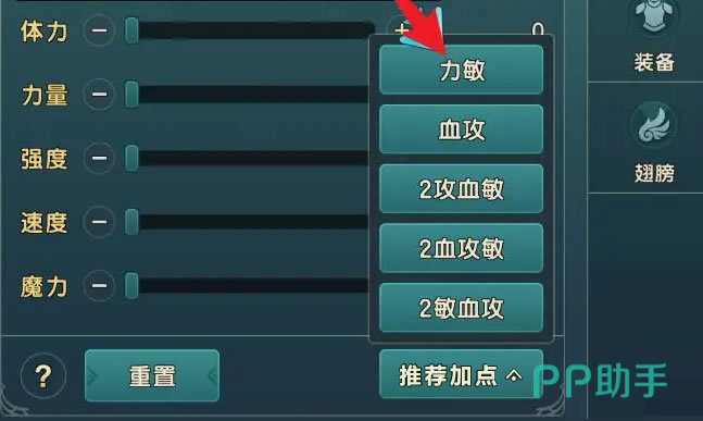如果有了明确的发展方向,可以通过推荐加点进行快速操作。在弓箭手的推荐菜单中有五项选择可以快速加点;首先是力敏,就是2点力量2点速度的配;而血攻,则是2体力2力量;2攻血敏就是2力量1体力1速度。攻在这里就是力量,血则代表体力,敏代表速度,作为物理角色不需要魔力。但是这里没有设定强度,所以当需要防御力的时候还是要手动加点。