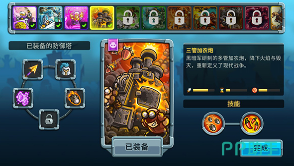 除了这个级别之外,还有a级的防御塔,首先有三管加农炮,这是一个在对战的过程中能稳定输出的防御塔,攻击的时候还可以用过热模式提升整体的伤害,非常适合前期开荒,相比之下比s级别的防御塔金币消耗数量要少,奥术法师可以产生的是较强的单体攻击能力,如果想要攻击血量比较高的成员,就可以合理利用分解射线技能,强化光环还能在对战的过程中获得更高的伤害增益效果,消耗的金币比s级别的防御塔要低一半,只要耗费300个金币即可。