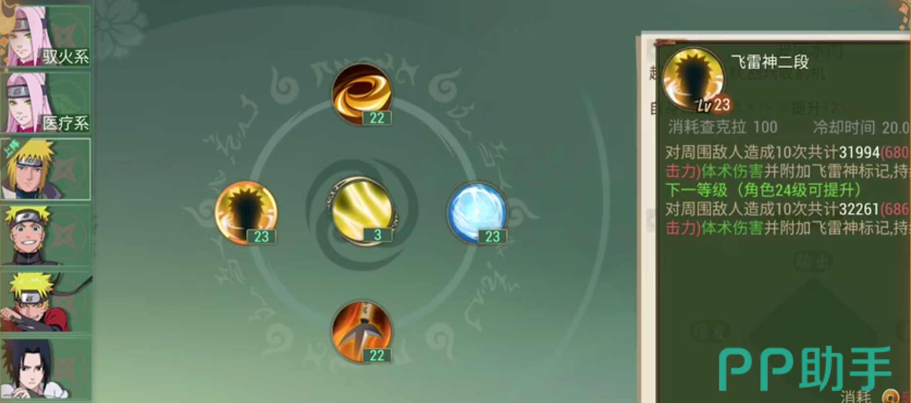 作为另一位主角,他的技能也是非常强力的。雷属性可以在连击中打出极高的伤害。普通攻击为挥刀和侧踢,其中还可以进入不可选取状态。技能一雷遁千鸟锐枪,第一前方发出一道雷电,并且施加雷电属性印记,技能二雷遁千鸟流,可以引爆雷电印记,并造成短暂的眩晕,技能三火遁豪火球之术,大范围伤害技能,清图神技,四技能咒印之力,强化自己的各种属性,并且在此期间所有攻击附带属性伤害。