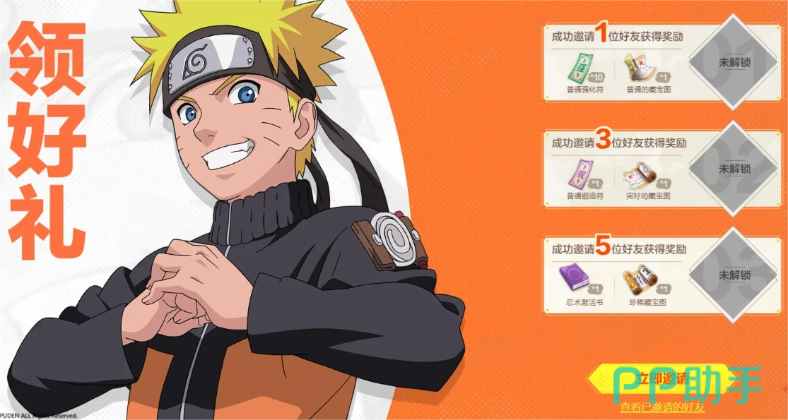 至于第二类奖励的话则是邀请好友的奖励,其内容包括“普通强化符x10+普通的藏宝图x1”,“”普通锻造符x1+完好的藏宝图x1,“忍术激活书x1+珍稀藏宝图x1”,这些奖励不仅能帮助你强化和打造装备,也可以让你获取更多稀有的忍术道具,队伍中忍者的上限因此可以被拔的更高。