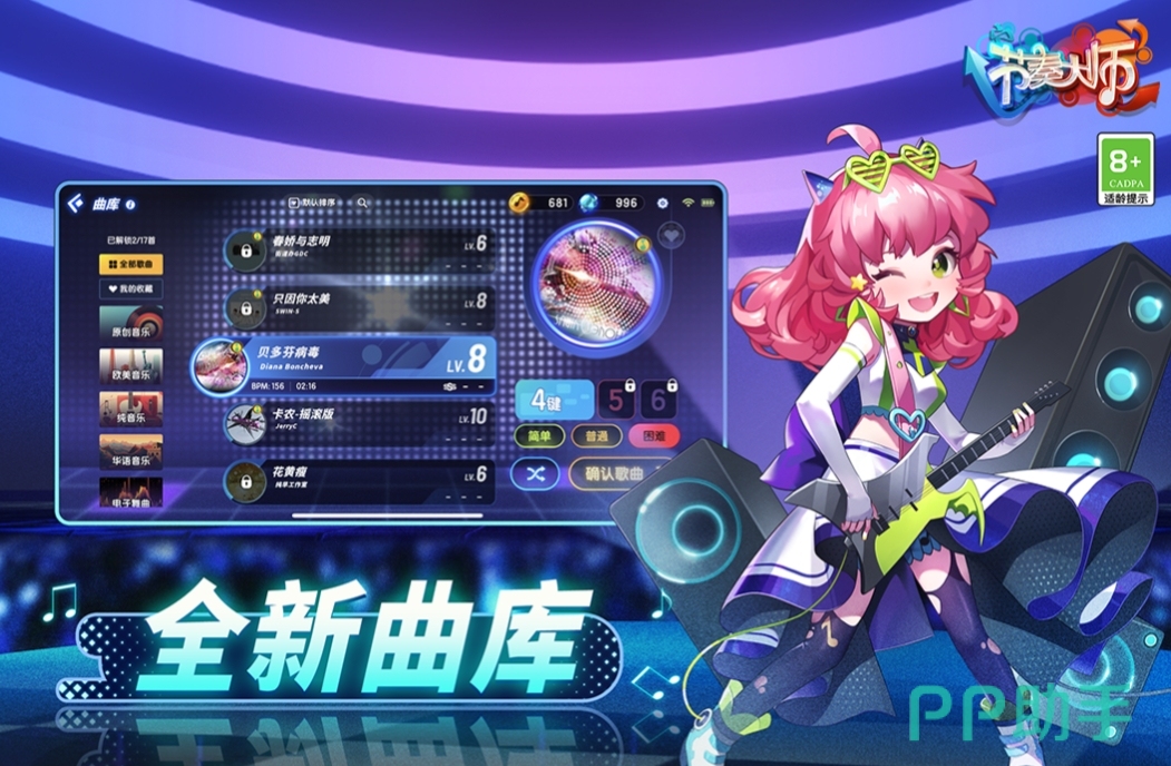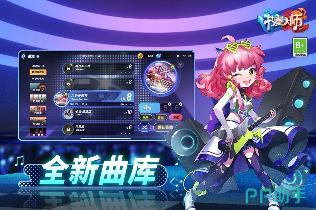 如果玩家想要更好的驾驭这个游戏,那需要了解一下游戏中的基础设定,玩家在游戏中可以在丰富的游戏曲库中挑选自己喜欢的歌曲,为了可以让玩家能够快速找到对应的歌曲游戏中给玩家区分了多个不同的类别,选择完歌曲之后就可以挑选模式,每一个歌曲都有三种不同的困难模式,玩家可以根据自己的能力进行对应模式的选择。