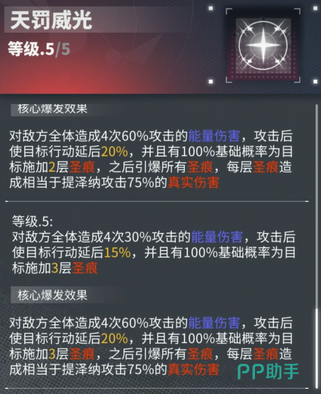 当提泽纳发动“天罚威光”时,她会对敌方全体造成能量伤害,并在攻击后让主目标的行动延迟,附加更多的圣痕。这使得提泽纳在群体战斗中表现出色,能够有效控制敌人的行动节奏,让敌人难以摆脱她带来的持续伤害。