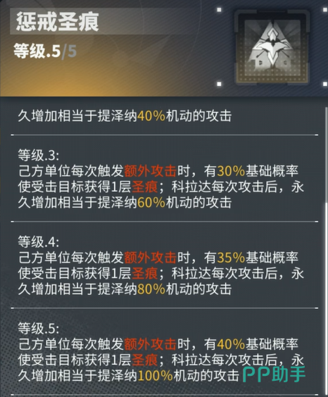 她的天赋一会在队友每次被攻击时,增加自己一定耐久上限比例的供给,若被攻击到的队友是机神单位,还会啊帮助其一同增加攻击力,她的天赋二会让自身和所有机神单位受到攻击后,额外获得同步率。