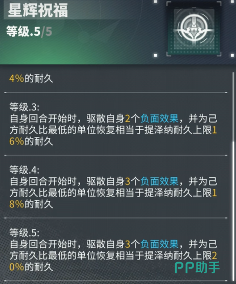 提泽纳的“星辉祝福”技能可以在她的回合开始时,驱散自己身上的负面状态,同时还能够为全队耐久最低的队友回复一定量的耐久。这个技能非常有用,尤其是在面对持久战时,能有效缓解团队的耐久压力,提升整体的战斗持久力。