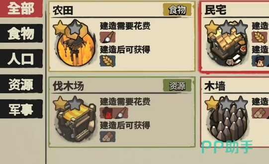玩家在开局时就需要优先的创建农田,保证食物的供应,如此才可以增加村民的数量。同时还需要建造伐木场以及采石场需要去积累石材,还有木材这两种资源。村民是生产力的关键,可以根据资源点的需求,然后去做出合理的分配,就需要实现资源产出的最大化。可以不断的探索地图,能发现一些额外的资源点,做好防御准备。不要只偏重于一种资源生产,要让木材还有食物同步增长。