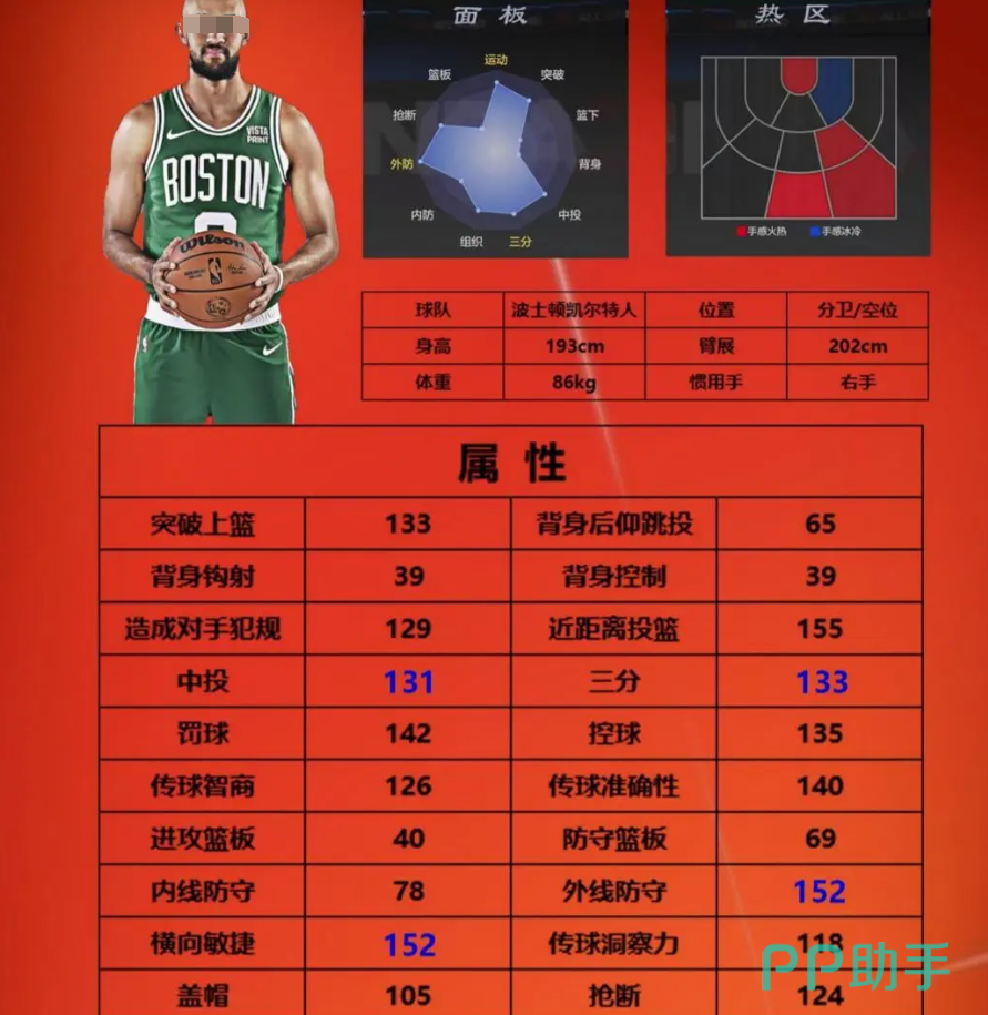 而传球洞察力方面哈登也展现出了极高的水准,数值达到了81分,他的传球不仅精准,而且常常能够送出一些令人意想不到的妙传,帮助队友轻松得分,然而就像任何一位球员都有相对薄弱的环节一样,哈登在篮板方面的表现相对来说略显逊色,进攻篮板数值仅为25,这意味着他在争夺二次进攻机会时,可能无法像一些篮板高手那样,频繁地抢下前场篮板球,为球队创造更多的进攻回合。