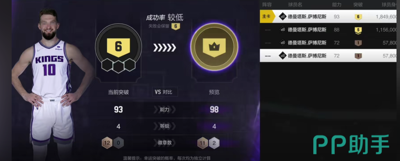 这款游戏中的球员分布非常多,哪怕是玩家花少量的资源,也能够养不错的球员。第2个介绍的是杜兰特,该角色在游戏中的表现也非常出色,拥有非常的三分球属性,这代表他进三分球的概率非常大,在打三分球的时候能够为玩家带来稳定的三分收益,并且它的突破和中距投篮属性也是。比较出色的,能够较好地进行突破防御进行拿分,不管是高端还是中端都有一战之力。
