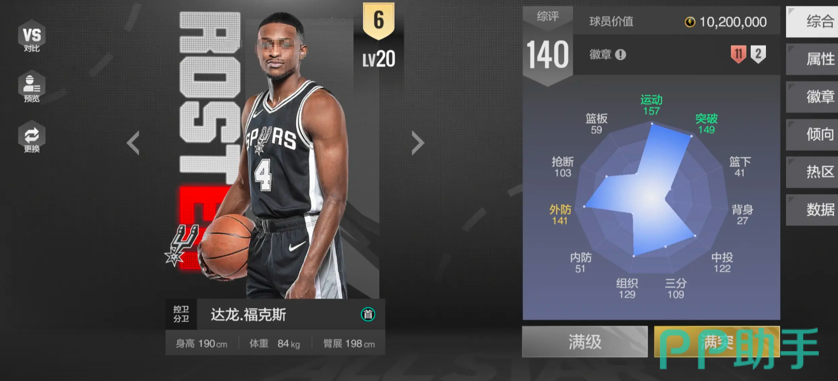 福克斯从身体静态天赋来看,他身高190cm,体重84kg,臂展更是达到了198cm,出色的臂展条件让他在防守时能够轻松地干扰对手的传球和投篮,同时在运动能力方面,他拥有高达101的数值,启动速度极快,能够在瞬间摆脱防守球员的纠缠,而在外防方面也有出色的防守功底,他可以紧紧地贴住对手,干扰对方的进攻节奏,甚至完成漂亮的抢断。