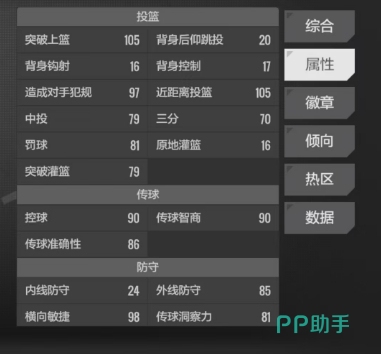 不过福克斯在其他方面的优势却足以弥补他的这些不足,在突破上篮方面,他有着高达105的数值,这得益于他出色的速度和爆发力,近距离投篮同样也是他的拿手好戏,105的数值表明他在禁区附近有着极高的命中率,无论是中距离的跳投还是近距离的抛投,都能精准命中目标,在传球效果方面,他的各项数值基本都徘徊在80到90之间,这说明他具备良好的视野和传球技巧。
