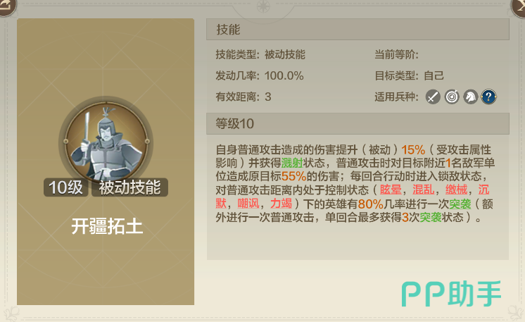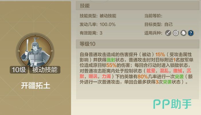 卫青的核心技能“开疆拓土”,让他在普通攻击中具有溅射效果,即在对目标进行普通攻击时,还能够对附近的另一名敌军造成55%的额外伤害。更重要的是,卫青在攻击被控制的敌人时,有高达80%的概率触发“突袭”,使其获得额外的普通攻击机会。每回合最多可以进行3次突袭,这意味着卫青在面对控制状态下的敌军时,能够打出巨量的伤害输出。