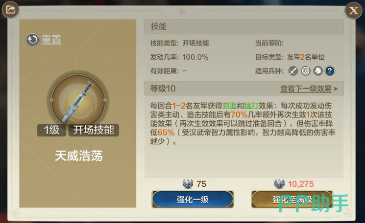 汉武帝的自带技能主打辅助,通过为队友提供各种buff,使得队友的主动技能有机会额外释放一次。这个额外释放与汉武帝的智力挂钩,考虑到他高达105的智力值,其增益效果非常明显。简而言之,汉武帝能够通过自身的技能,帮助队友在关键时刻打出额外伤害。特别是在与强力的主动技能型输出角色搭配时,他可以显著提升整个队伍的爆发能力,瞬间改变战局。