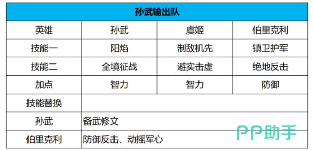 这套阵容以孙武和伯里克利作为主力输出,配合虞姬的控制技能,能够实现快速清场的效果。孙武作为签到即可获得的英雄,获取难度较低,伯里克利和虞姬也相对容易从卡池中抽取。需要注意的是,孙武最好配备阳焰技能,这个技能能显著提升他的输出能力,是这套阵容的关键所在。