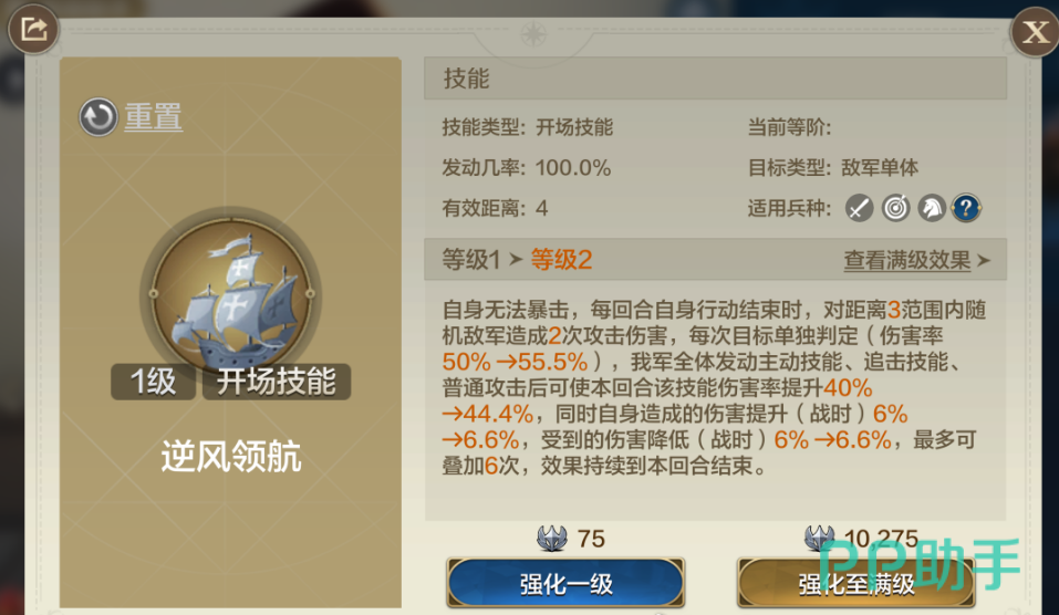 哥伦布的自带技能“逆风领航”让他在战场上占据了独特的地位。该技能在回合结束时,会对三格范围内的敌人造成两次攻击伤害,这一伤害不仅具有增伤效果,还能有效提升全体友军的主动技能、追击技能和普攻的伤害。这种多重增益效果,使得哥伦布成为一个强力的输出统帅,能够在多个方面提升己方阵容的整体火力。