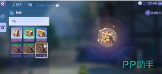 在制作背包时,玩家就需要第1步来到工程台。来到这里之后就可以选择缝纫页面,一般背包的制作其实和缝纫之间会有紧密的关系。玩家在制作背包之后就能迅速的提升缝纫的等级。