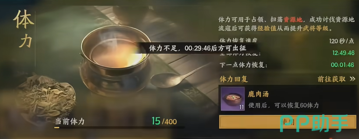 Pve的进度是受体力限制的,挑战pve任务时对体力的上限值为120点。所以在完成任务时,可以先服用鹿肉汤补充60点的体力,如果能够完成章节内的其他任务,还能够获取更多的体力奖励,只要体力充足就能够持续满足 Pve模式下的任何挑战任务。