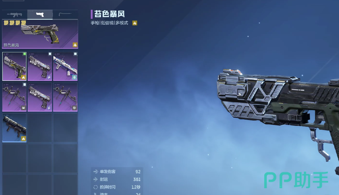 苔色暴风在游戏当中是低倍镜手枪,于游戏当中的定位是副武器,单发伤害92点,射速为361点,换弹时间为1.2秒,弹匣容量为24,总弹匣量是216枚,其精准度和稳定性,在手枪当中都是不错的,分别是72和65。