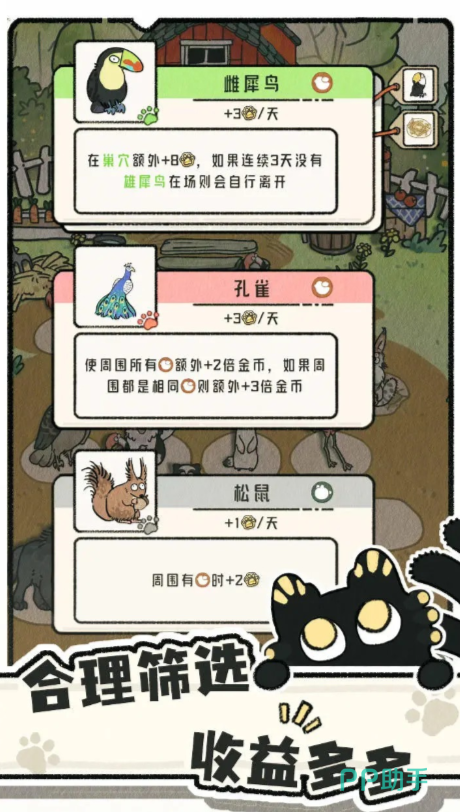 在这个游戏的世界中,会有上百种的小动物,每一个都会有对应的绝活。如果把这些小家伙搭配在一起,那就可以玩出转金流派。猫神牧场图鉴分享给所有的人,玩家可以通过这些动物图鉴去挑选自己所喜欢的。当然也并不追求全图鉴收集,大家可以挑选几个核心的动物,如此就可以轻松的搭建专属的收益流水线。