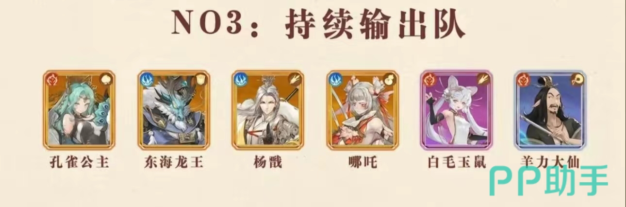 T2:这一阵容相对前面的阵容强度较弱,属于打持久战类型,主要有孔雀公主、哪吒、羊力大仙和杨戬等组成,通过长久持续输出取胜。