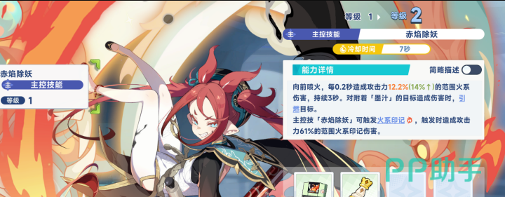 可以先来看一下主控玩法,虽然并不算很拉胯,但会拥有明显的局限性。赤焰除妖这就是主控技能,可以直接向前方扇形位置去持续的喷火,每0.2秒就可以造成12.2%的攻击力。持续三秒的输出覆盖,还是比较可观的。如果敌人身上被普攻施加了墨汁效果,那还可以直接触发引燃,会拥有一个额外的伤害。同时主控技能在命中时还会有一个火系印记,就可以直接造成攻击力61%的范围性印记伤害。不过主控玩法更适合于前期还没有成型的队伍,后期在面对密集敌人时,就会拥有比较出色的清场效率。