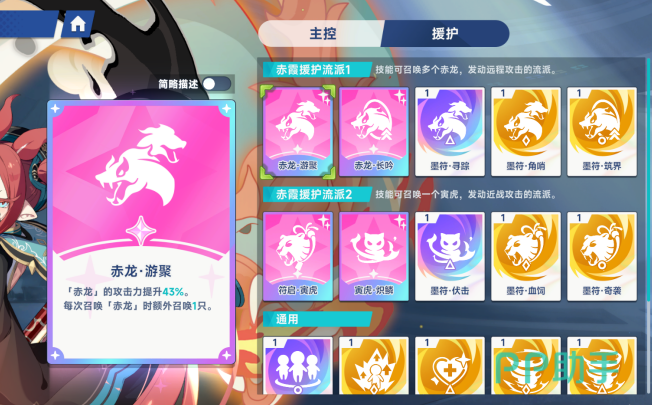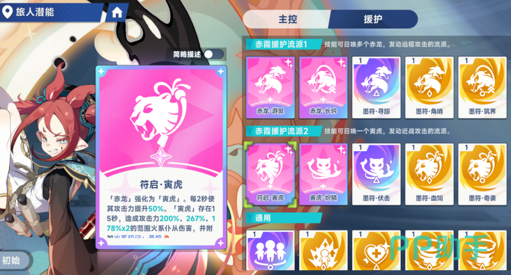 从潜能这一方面来看,援护玩法还会有两种主流的方向,第1种就是选择赤龙流派。推荐直接点赤龙游聚,还有赤龙长吟。一个可以提升赤龙43%的攻击力,一个就可以在召唤时额外的多召唤一个。不仅可以增强单只赤龙的伤害,还能迅速的提升召唤的数量,进一步的提高总伤害量。那第2种就是寅虎流派,符启寅虎这就是相应的潜能,可以召唤一只近战作战,同样可以给敌人带来一个火属性的印记,并且自身所造成的单体伤害一点都不输。值得一提的就是援护技能有18秒的冷却,搭配两种潜能流派的效果,就可以实现无空窗期的覆盖。