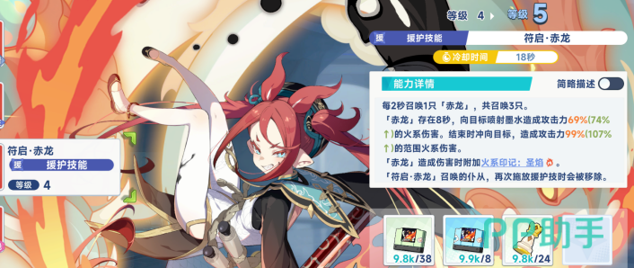 在养成的时候还需要注重于援护位置的玩法,核心技能就是符启赤龙,这就等同于是或对上印记的神器,这一个技能冷却的时间是18秒,基本上每两秒就可以召唤一只赤龙。一共可以召唤三只,是龙存在的8秒内,就会持续朝着目标去喷射墨水,造成攻击率69%的火系伤害,在结束之后还可以冲向目标打出攻击力99%的范围性伤害。更关键的是还可以高频率的给敌人挂上火属性的印记,配合其他角色的印记爆发,那输出就会直接翻倍。