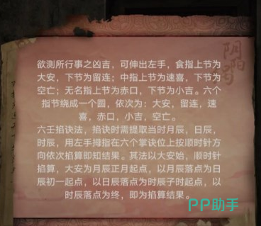 当玩家正置身于一个充满未知与挑战的世界,眼前是一个需要解开的古老谜题。这时六壬掐指法不急不躁,用它那固定而有序的步伐大安,留连,速喜,赤口,小吉,空亡,一步步引导玩家走向真相的彼岸。其实六壬掐指法原本是用来预测胎儿性别的古老方法,但随着时间的推移,它逐渐演变成了一种更加广泛的占卜术。在阴阳锅3中,这种古老的智慧被巧妙地融入了游戏设计之中,成为解开特定谜题的关键。