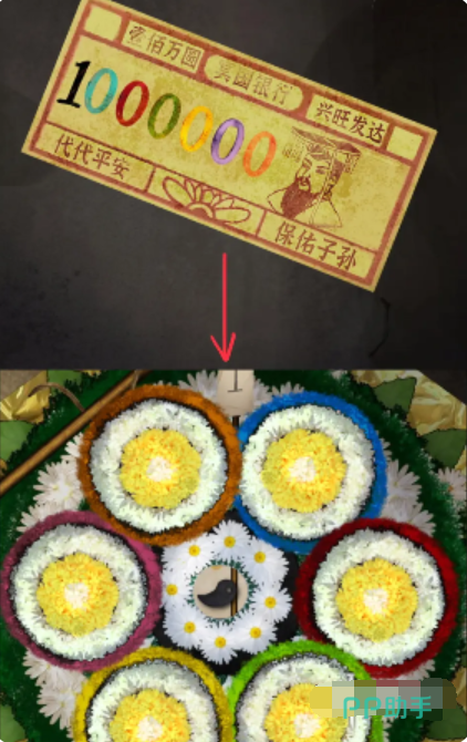7、点击打开花坛的开关,观察人形图案亮起的顺序,根据顺序线索依次点击灯笼的两个吊牌,得到花钱。
