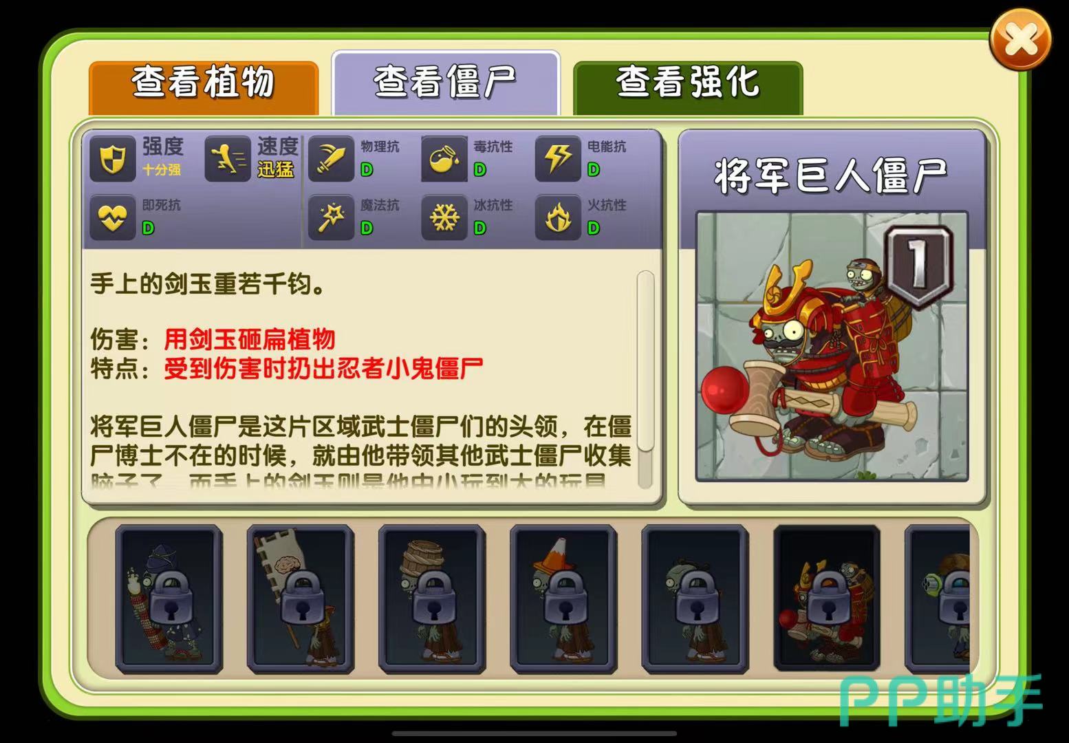 而撑杆跳僵尸可以越过一些植物,所以玩家需要观察撑杆跳僵尸的走位,提前布置好例如土豆地雷等可以短时间快速消灭僵尸的植物,以免撑杆跳僵尸进攻到后排植物;巨型僵尸在游戏中属于最强级别的僵尸,它还会携带小鬼僵尸,巨型僵尸的高生命值和快速消灭植物的属性使得玩家难以抵抗。