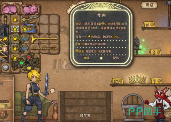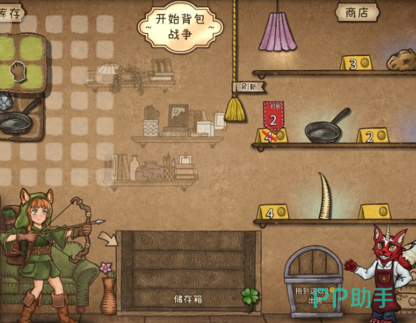 在游戏中新手玩家建议使用平底锅作为主要的武器,因为平底锅容易上手,且耐力消耗非常低,可以长期的在手中使用,每回合结束之后,玩家都可以进入商店来购买物品和售出物品,在游戏中出售物品是获取金币最简单的手段,玩家还能够购买存钱罐将金币存储进存钱罐中,存储的金币可以带到后面使用。