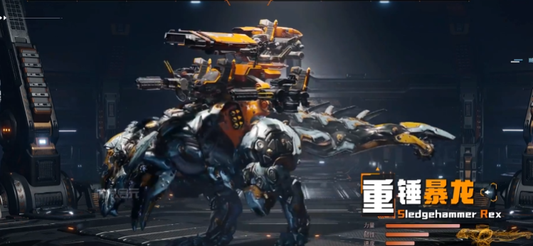 第二个为大家推荐的就是重锤暴龙,在目前近战类型的机械兽当中,它具有的压制力也是非常强的,而且在整体的移动效果当中,身高和体型也是目前最大的一个机械兽,达到了超8m的体型可以带来的冲击力也是非常高的,机身上面他用的是双液压式的手臂搭配了一个震荡式的尾锤,所以在身体部件上面看起来也是充满了力量感,在核心的效果上面,它提供的爆发能力也是非常强的,搭配的震荡式尾锤在游戏当中也是可以快速的扩大自身攻击的范围,在冲击能力的释放效果上面足够打出更高的输出,后期在常规的基础攻击能力上面,其实包括的一些动作有冲撞以及甩尾的两个基础能力,特别是在其中利用这样的冲撞动作,其实可以带来的力度也是非常高的,可以穿透对面身上的新型护盾,所以在遇到一些有防御效果的机械兽士,大家就可以上重锤暴龙来进行攻击,而后续进行甩尾的话,也可以对大范围的目标都造成攻击能力,同时击中的敌人身上还会有3秒的减速影响,降低敌方的机动能力还是非常有用的,他的特殊技能叫做区域爆震,这个技能只是在半径12m之内的定点引爆之后,还可以带来足够强势的冲击波,对于一些群里的人来说也是有非常强势的范围攻击。