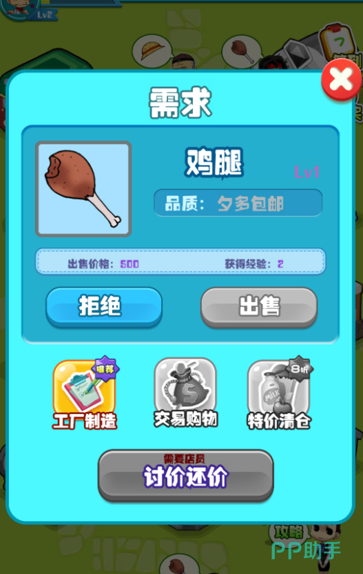 在每一家店铺中,顾客都会有着不同的需求,比如说有些顾客需要鸡腿,而有些顾客需要帽子,此时小伙伴们就需要前往市场里面进货。如果你觉得市场所给出的进货价格太高,担心出售之后所获得的利润太低,也可以带上一名比较会讲价的店员,让他来帮你砍价,这样也能够帮助你获得更多的利润哦。