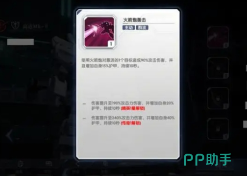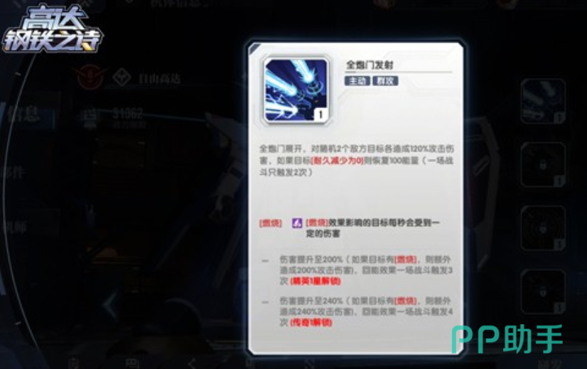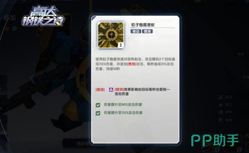 角色还有一项技能,就是可以提升自身机甲的攻击速度,在战斗的过程,角色能用自身的粒子炮粒子炮,对对手展开凶猛的火力攻击,对方在受到一定伤害之后还会叠加燃烧状态,这种燃烧状态能让对方持续10秒钟的攻击伤害,每秒都能带来15%的伤害,可以借助角色的这项技能在战斗的时候稳定输出。