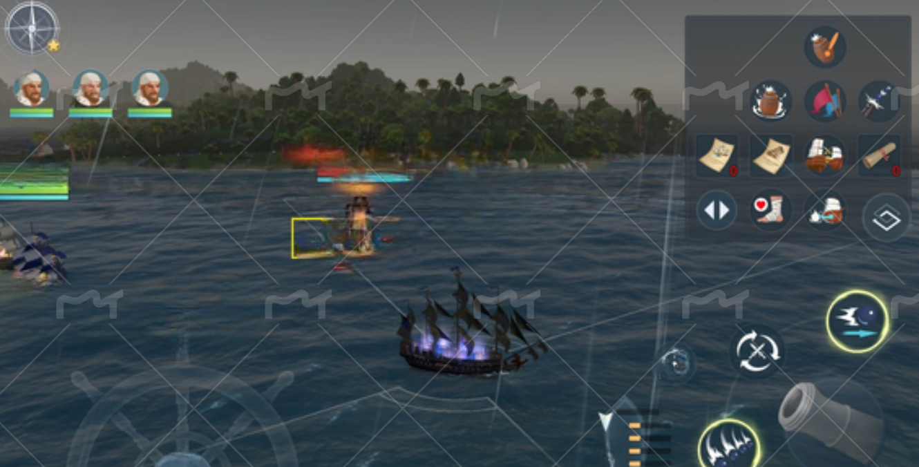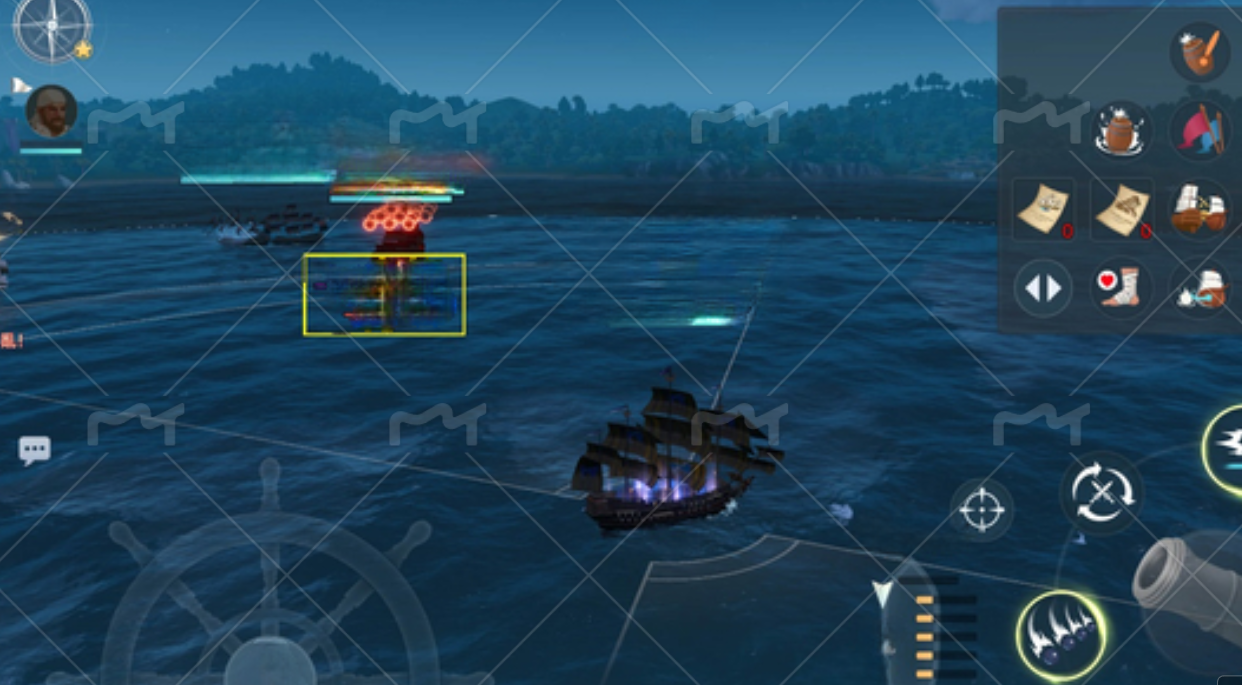 蓟花号战局的关键在于瓦解其护卫舰群。战斗开始时,玩家会注意到蓟花号周围有5-6艘西班牙战舰,它们会优先攻击靠近的友方NPC船只。此时切忌贸然突进,应保持中距离(约半个屏幕范围)游走,利用远射程火炮(如长管加农炮)锁定最外围的一艘敌舰攻击。被命中的敌舰会脱离编队追击玩家,此时迅速拉开距离,将其引至战场边缘1v1解决。
