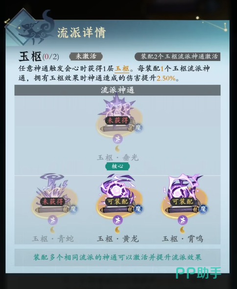 伏龙流派的核心神通为伏龙·摧峦,搭配决云、掠影和折花可以提升对低生命值目标的伤害,每多装配一个伏龙神通,对低生命值目标的伤害提升4%。