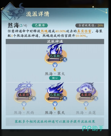 天炉流派:核心神通为天炉·陨火,搭配炽炎、流萤和丹朱可以提升引爆伤害,每多装配一个天炉神通,引爆伤害提升15%。