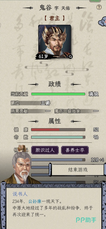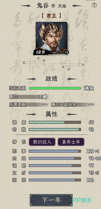以上就是三国人生通关攻略的内容了。总结一下,想要在三国人生中脱颖而出并顺利通关,关键在于能力的均衡培养和资源的合理配置。稳步推进,保持对内政和军事的双重关注,确保自己能在任何战场上都能立于不败之地。慢慢积累经验,充分利用每个角色的特长,最终你一定会成为一位三国的霸主!