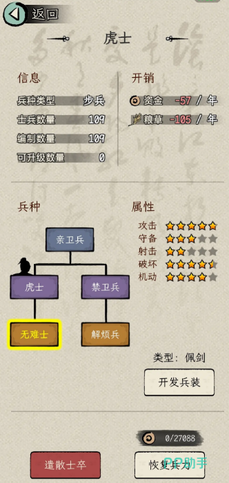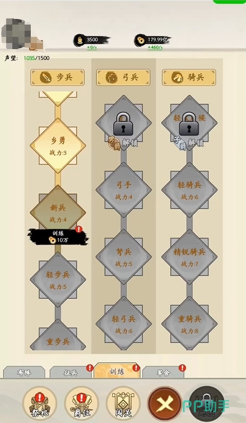 相生相克,步克弓,弓克骑,骑克步。更高级的兵种需要达到一定官职,拥有对应兵书后解锁,兵书在主要在城市的【搜索】和“意外之财”两个地方几率产出。