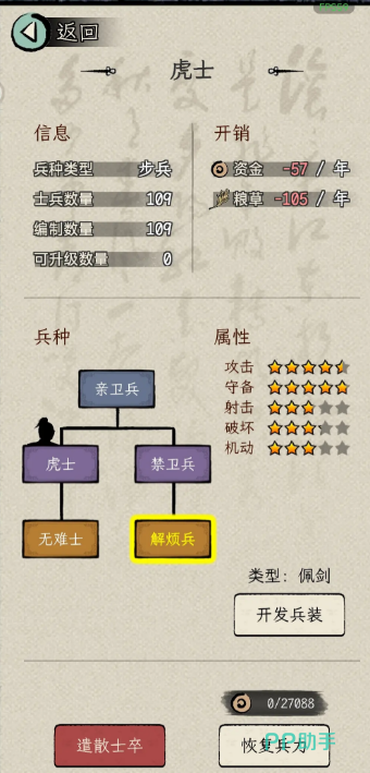 骑兵系部曲操作简便且许昌可招募顶级虎豹骑。五品官时可招募2000兵力,足以应对前期需求。