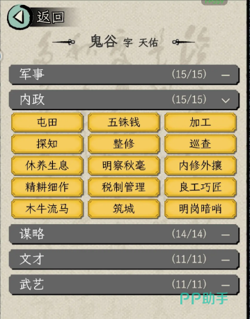 接下来是通关的关键能力点。武艺的提升一定不要急于追求高爆发,而是稳步推进,先达到90左右后,通过缉拿任务可以稳定刷到强力技能,几乎无敌。内政能力方面,初期的建筑如果能够提高一些,会让你在后期做将军任务时省不少事,成功率自然也高。至于文才,除非是走谋士路线,否则普通的任务和活动就让诸葛亮帮忙处理即可,顶着也能行。军事能力中,先学连射和箭雨是最为实用的,尤其是在战场上,提前布置好阵型可以大大提高打击效果。
