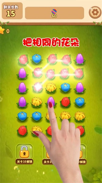 游戏采用经典的连线消除玩法,玩家需要观察花朵的排列,通过滑动连接相同颜色的花朵,使其消失并触发连锁消除效果。关卡目标各不相同,可能是收集指定数量的花朵,也可能是在限定步数内完成特定任务。随着挑战深入,关卡设计逐渐丰富,特殊障碍、限时挑战等机制的加入,使游戏更具策略性与趣味性。