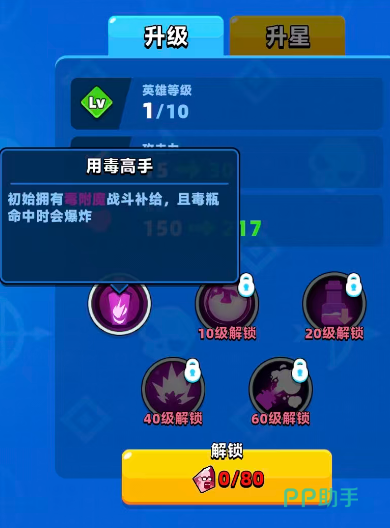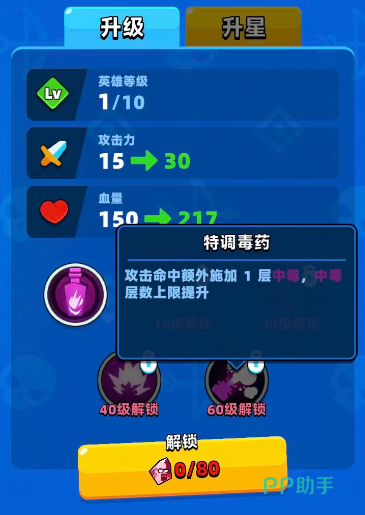 当然整体技能效果最好的时候还是在他达到60级的时候,这个时期可以用的技能叫做特调毒药,在毒药师本身攻击命中属性上面还会额外增加1层中毒的效果,而且在整体的中毒层数上限上面会有数值提升,有这个技能大家就可以多给敌人叠几层中毒了,除了这些依靠等级解锁的技能之外,想要毒药师更好用,其实升星也是避免不了的,毒药师在解锁了更高星级之后也会有额外的技能效果可以提升。