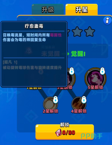 毒药师达到3星的话,可以用到的技能有长效毒药!技能,可以为大家带来觉醒的效果,也就是积攒2次充能陨石数量,然后带来一些生命回复比率的提升,此时对于所有的毒属性伤害还有进一步的提升,在达到4星的时候他解锁的技能叫做受击充能,这个技能给他的攻击与血量提升效果也是有一些的,然后就是在他受到攻击时,也能为自己的觉醒技能进行充能,最强的效果实在五星的时候可以解锁的长效毒药Ⅱ,这个技能需要积攒3次充能,然后在陨石数量以及毒药师本身的生命回复比率上面有一定的数值提升,且敌人如果首次达到中毒层数上限数值的时候,还不可以再一次触发伤害。