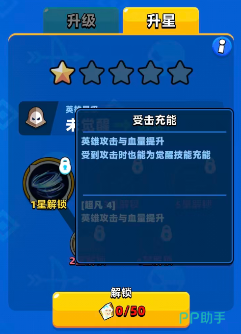 在角色达到4星的时候,在上面久经战阵的技能就可以用,这是一个被动效果的升星技能,可以带来的是英雄在攻击能力与血量数值上面的提升,最后一个就是冰雪女王在最高星5星的时候可以用到的技能,叫做受击充能,使用这个技能的时候英雄攻击数值以及血量提升的数值都会在她受到攻击时,得到一定的加成,这个时候是能为大家使用觉醒技能进行提前的充能,所以只要达到5星的阶段,大家就不用担心觉醒技能的释放次数不够啦。